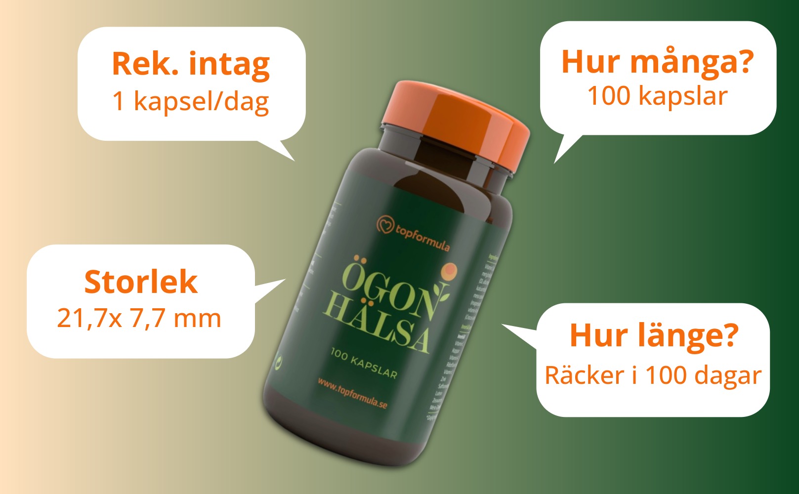 Ögonhälsa kombinerar vitamin A, zink och vitamin B2 – näringsämnen som spelar en viktig roll för att bibehålla normal syn och slemhinnornas funktion. Dessutom innehåller den växtbaserade ämnen som lutein, zeaxantin och saffran. Ett genomtänkt innehåll för dig som vill ta ett helhetsgrepp om ögonens välmående.