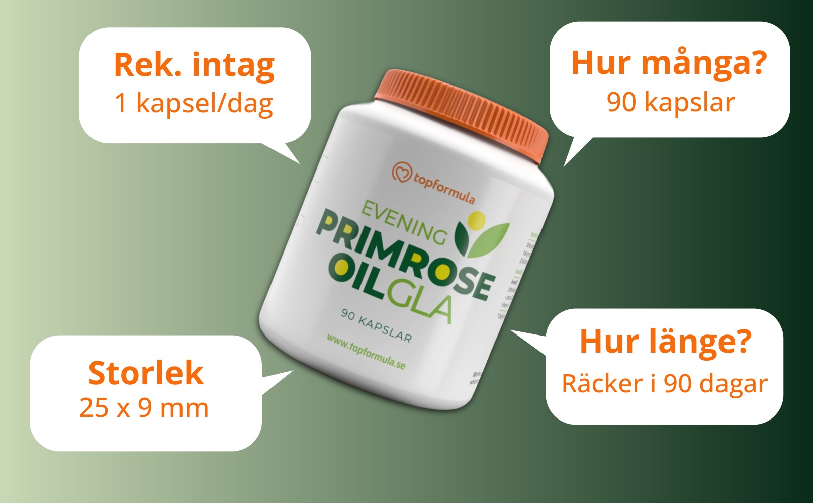 - 1000 mg jättenattljusolja per kapsel – varav 90 mg GLA